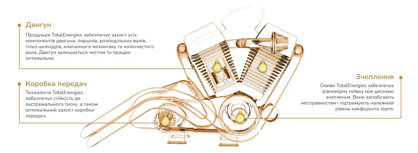 Компанія TotalEnergies спеціалізується на виробництві моторних олив, які отримали схвалення і позитивні рекомендації провідних автовиробників та виробників мототехніки. Їх застосовують як в якості олив для заводської заливки, так і для післяпродажного обслуговування для мотоциклів і скутерів.